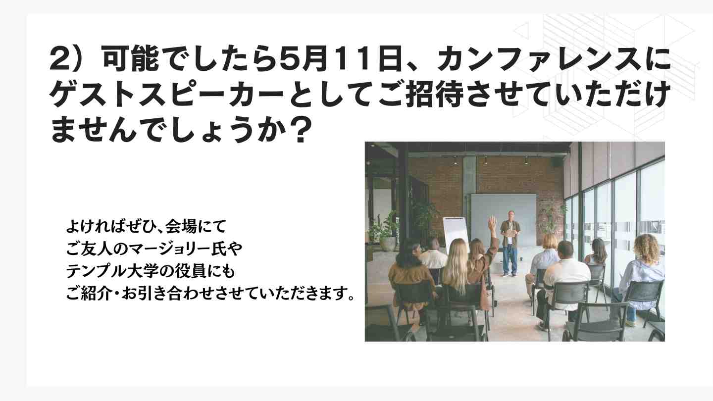 カンファレンス開催の案をマージョリーからもらってから、2ヶ月ほど私の判断が遅れた経緯がありました。