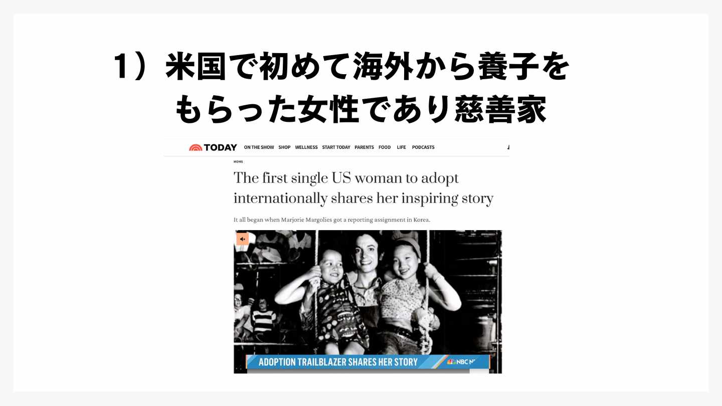 元米国議員、元ジャーナリスト、米国で初めて海外から養子を引き取り長く慈善活動をされてきた方。
